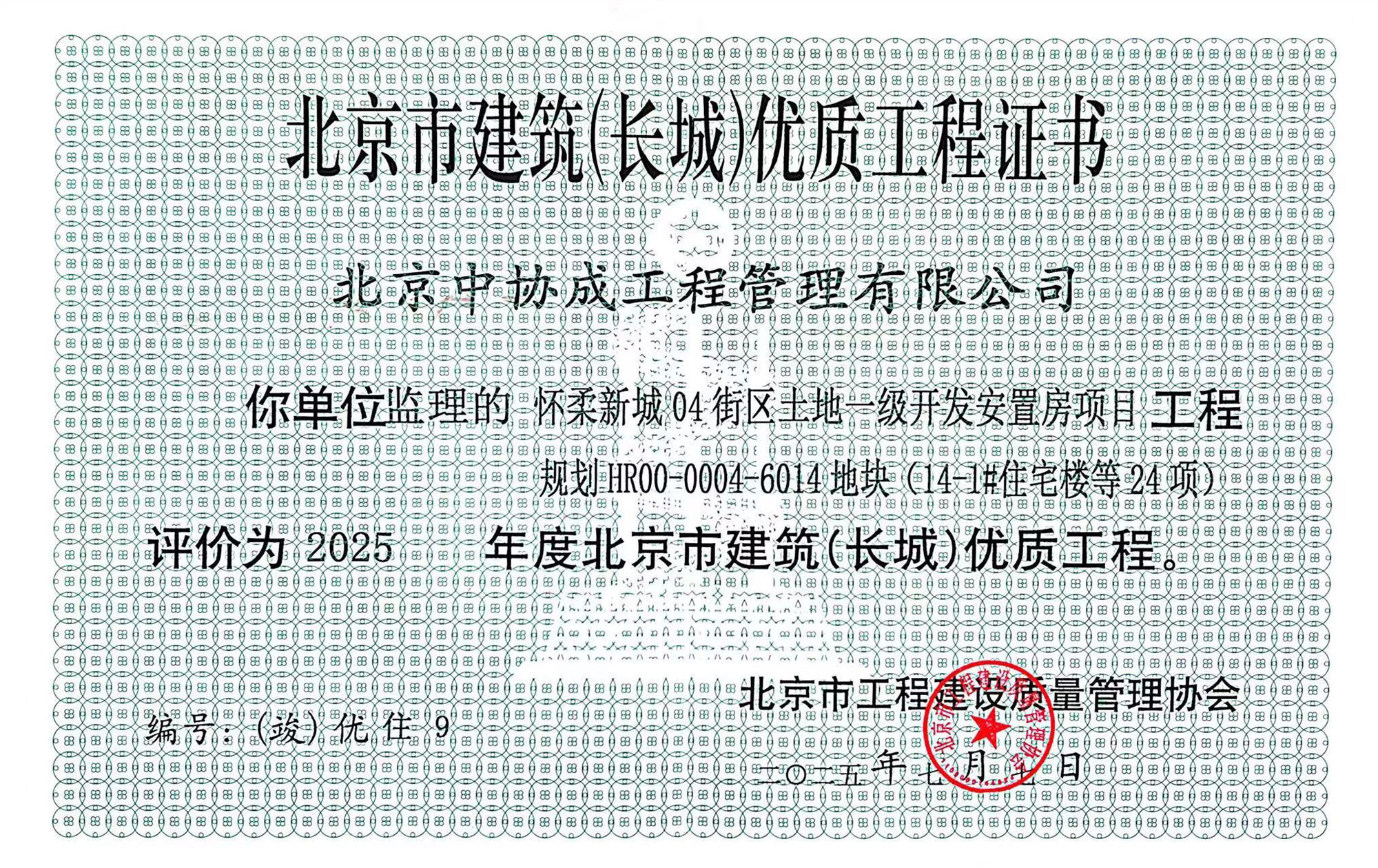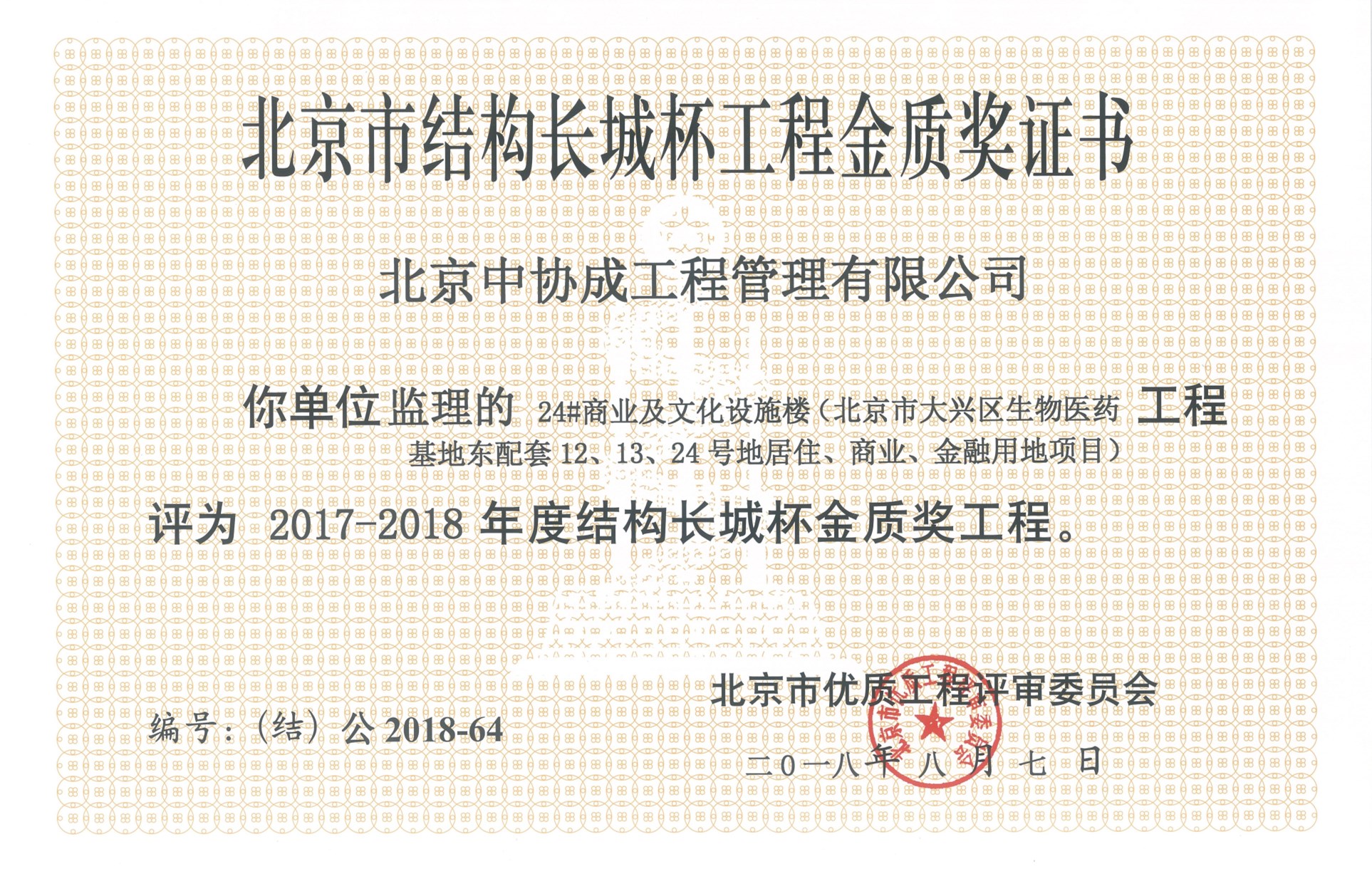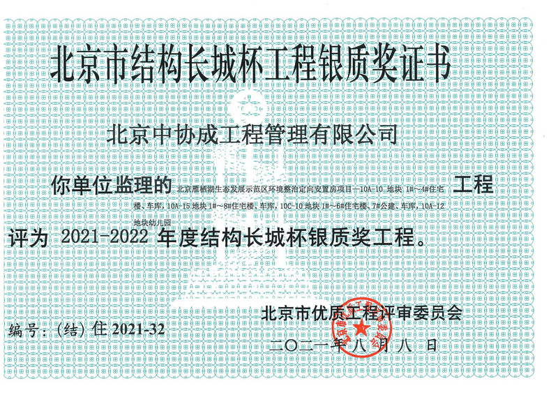 北京市結(jié)構(gòu)長城杯工程銀質(zhì)獎證書