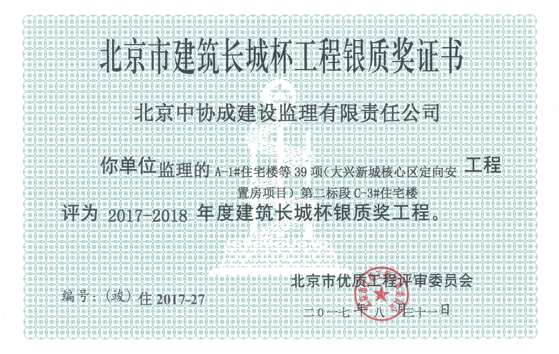 2017-2018大興安置房第二標(biāo)段C-3#住宅樓建筑長城杯銀質(zhì)獎