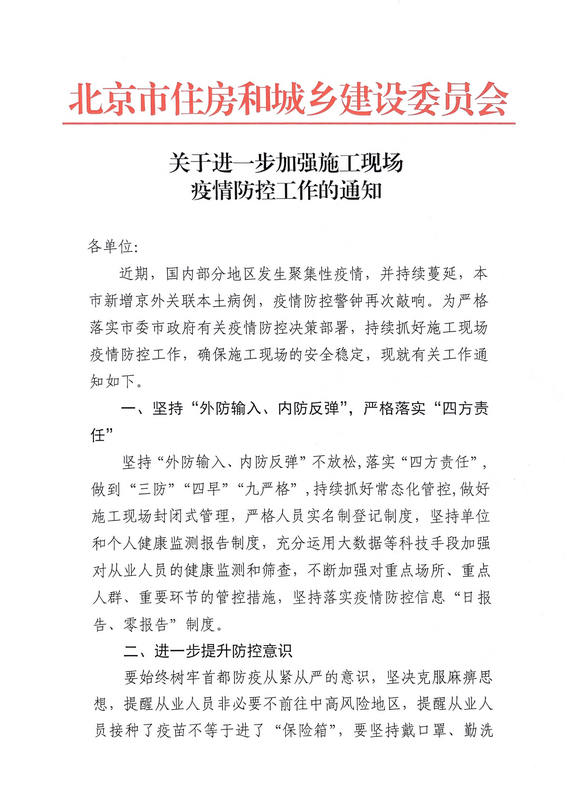 北京市住房和城鄉(xiāng)建設(shè)委員會關(guān)于進(jìn)一步加強(qiáng)施工現(xiàn)場疫情防控工作的通知