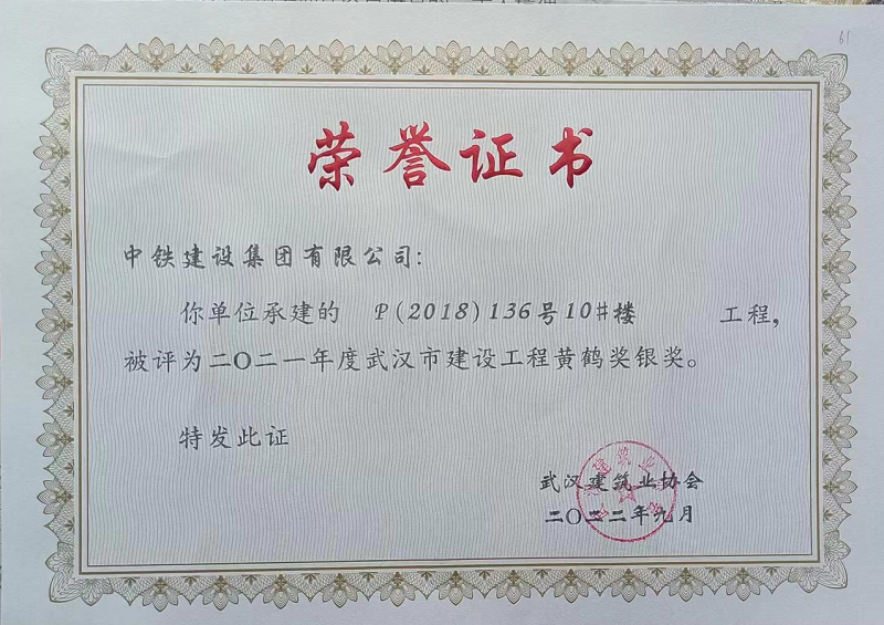 二〇二一年度武漢市建設(shè)工程黃鶴獎銀獎-P(2018)136號10#樓工程